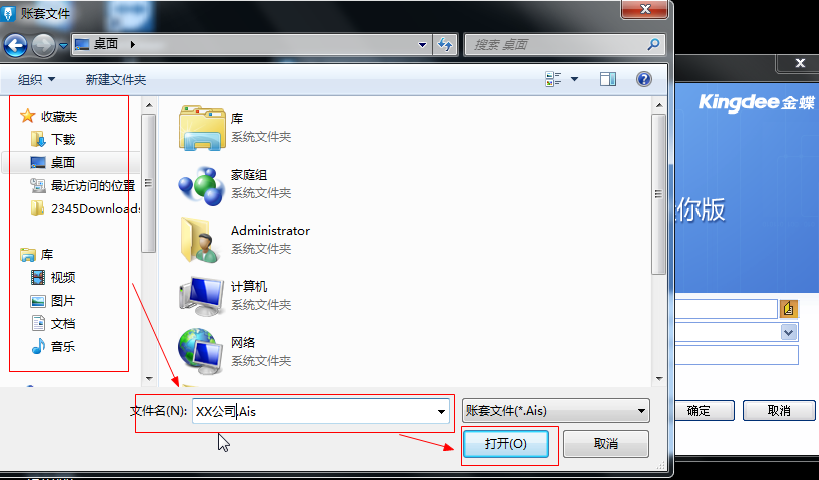 第三步:在跳出来的界面中现在左边选择账套要存放的位置--在下方红框内输出新建账套的名称-再点击打开,如图 3所示